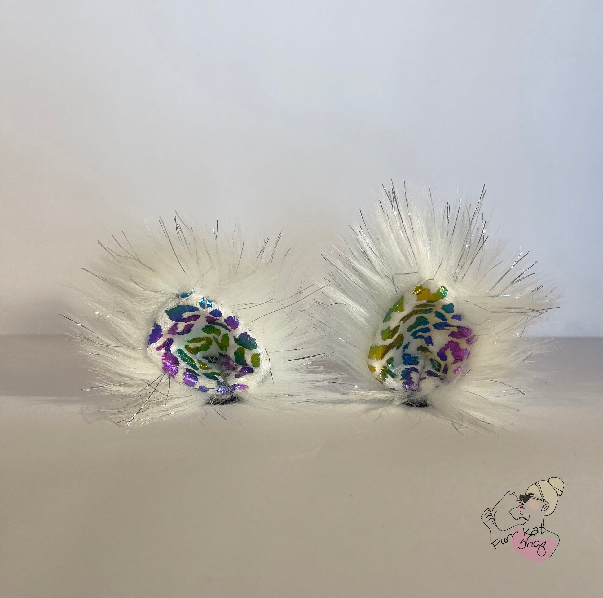 Deze oortjes zijn wit aan de buitenkant en hebben een multi kleuren binnen kant. Deze oortjes zijn de perfecte accessoire voor kattenliefhebbers die op zoek zijn naar een leuke en speelse look.
